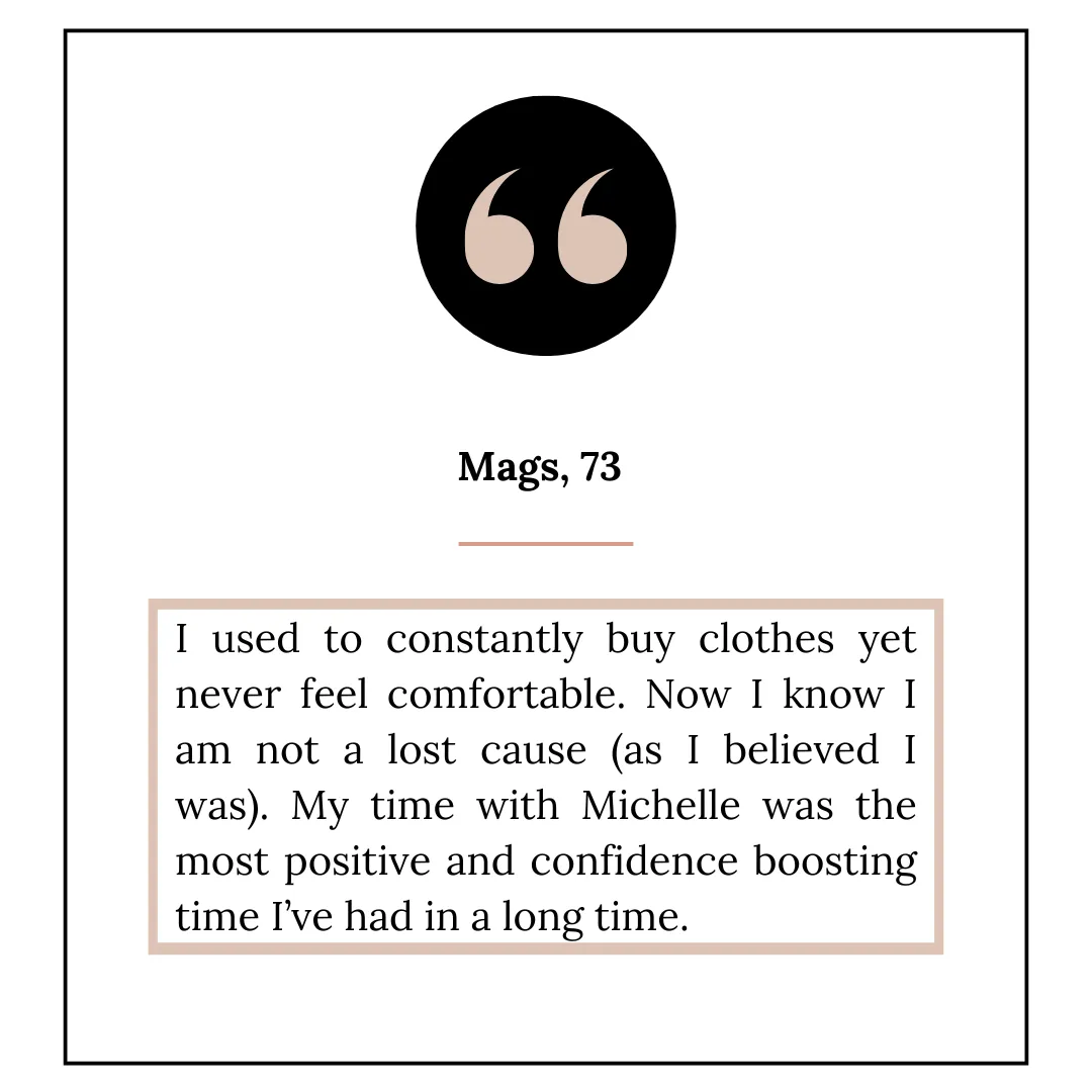 "Michelle this experience has transformed my life. Getting dressed is so much easier now. It's also going to save me hundreds of pounds from buying the wrong things in the future."."